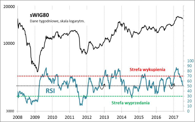 Ta płaska co prawda, ale dość długotrwała korekta sprowadziła popularny wskaźnik techniczny RSI (uwaga - w wersji opartej na danych tygodniowych) z poziomów świadczących o silnym "wykupieniu" (przegrzaniu) do pułapów neutralnych. Niektóre korekty w przeszłości zatrzymywały się już w tej okolicy (choćby ta w listopadzie 2016) lub nieco niżej, aczkolwiek bywało też przecież dużo gorzej. Z naszych wyliczeń na podstawie danych od 2009 wynika, że 20% ruchów spadkowych zatrzymywało się, gdy RSI spadał w okolicę 50 pkt., a kolejne 30%, gdy był w przedziale 40-50 pkt.