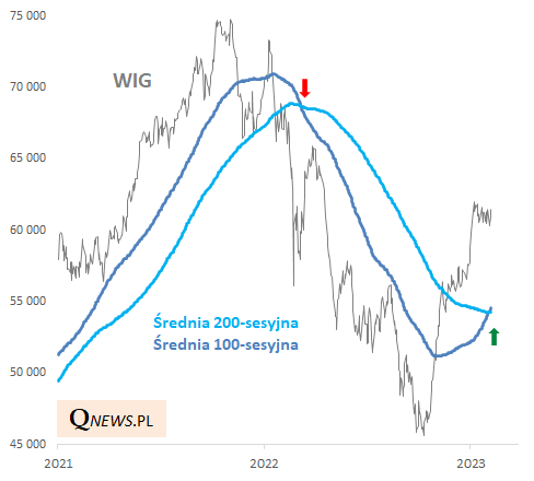 Ciekawy sygnał na GPW dla fanów analizy technicznej. W ostatnich dniach na wykresie WIG-u pojawił się "złoty krzyż" (golden cross), rozumiany jako wzrost krótszej średniej kroczącej (w tym przypadku 100-sesyjnej) powyżej dłuższej średniej, liczonej z 200 sesji. Książkowo jest to sygnał potwierdzający trend wzrostowy. To odwrotność analogicznego "krzyża śmierci", który pojawił się w marcu 2022, wkrótce po rosyjskiej napaści na Ukrainę.