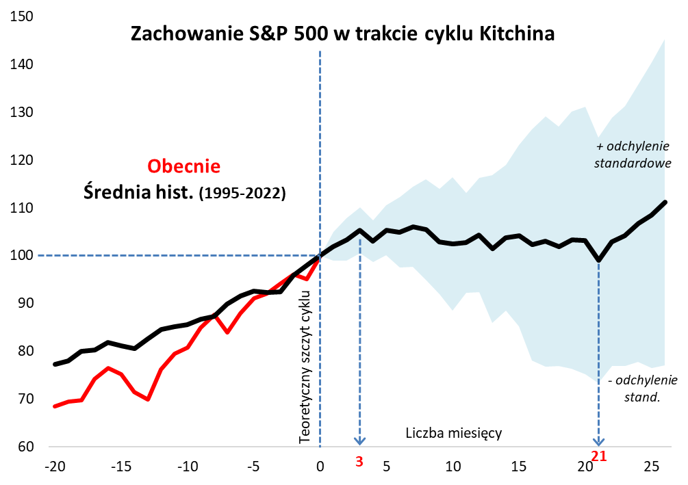 Porównując zachowanie S&P 500 i WIG w trakcie cyklu Kitchina zauważyliśmy intrygującą zależność. O ile przez większą część fazy wzrostowej nasze rodzime akcje typowo zachowują się relatywnie lepiej (tzn. drożeją mocniej niż amerykańskie), to – średnio rzecz biorąc – szczyt tej siły relatywnej osiągają 3 miesiące przed teoretycznym szczytem cyklu Kitchina. A po osiągnięciu tego punktu kulminacyjnego potem zachowują się dla odmiany relatywnie słabiej – i ta słabsza postawa obejmuje potem niemal całą fazę spadkową cyklu (dopiero w jej końcówce modelowo dochodzi do stabilizacji).