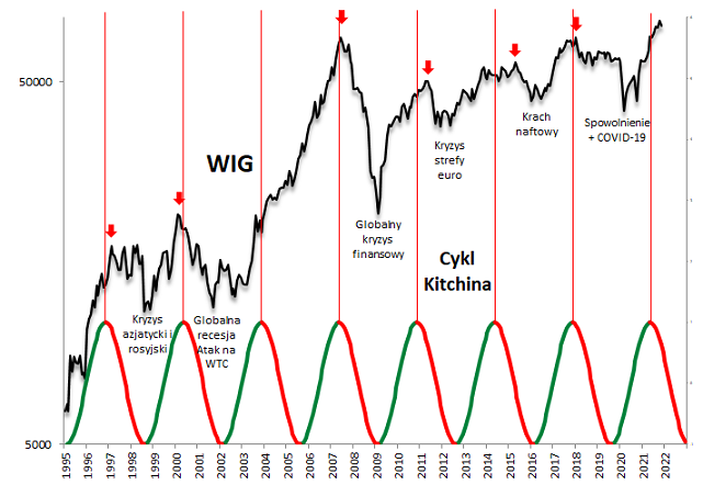 - w sześciu spośród siedmiu historycznych przypadków faza spadkowa cyklu Kitchina na GPW przynosiła spadek WIG nie mniejszy niż 26 proc.;