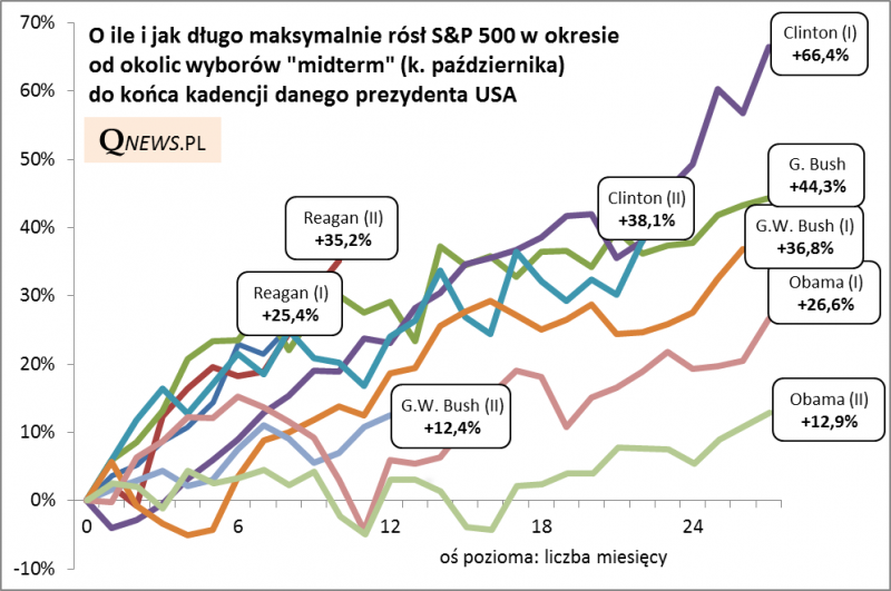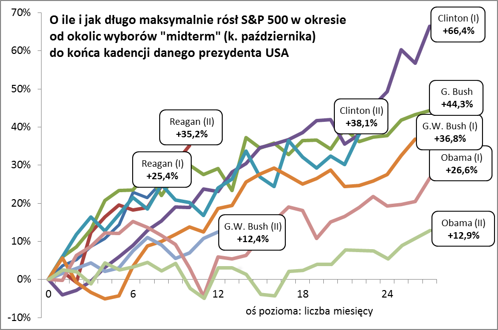 Na podstawie dziewięciu przypadków z tego okresu wyłania się pewien interesujący schemat. Okazuje się, że w pierwszych dwóch kwartałach po „midterm elections” we WSZYSTKICH przypadkach S&P500 kontynuował hossę, a w prawie wszystkich trend wzrostowy utrzymał się przez ok. trzy kwartały.