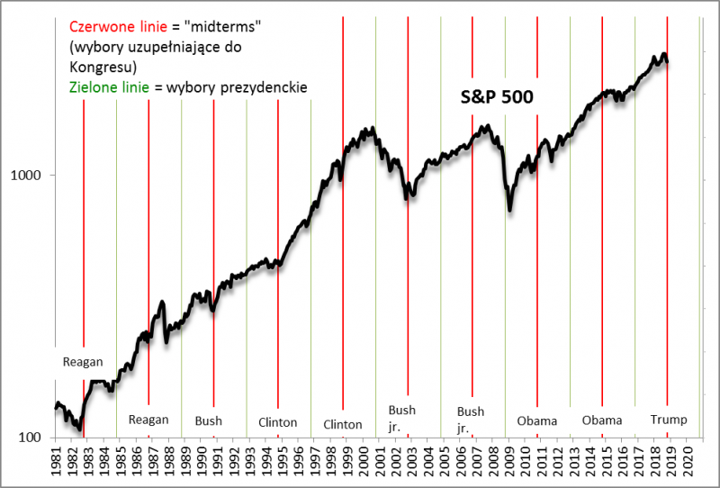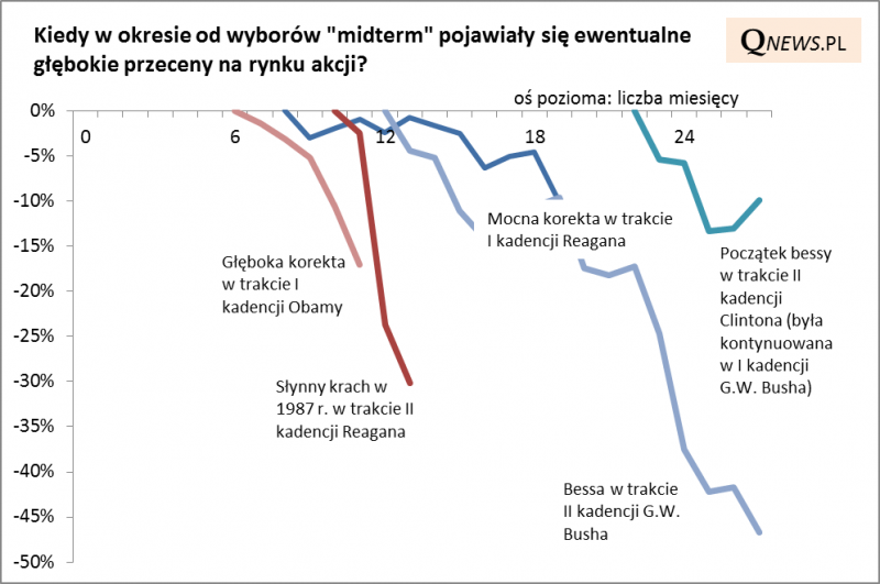 Mniej jednoznaczne jest natomiast to co działo się później. Jeśli już miały się pojawić jakieś większe powody do bólu głowy dla inwestorów (w wielu przypadkach się nie pojawiły), to działo się to najwcześniej po upływie 10. miesięcy od wyborów połówkowych. To w tym okresie doszło do pamiętnego wielkiego krachu na jesieni 1987 i to właśnie w jego trakcie rozpoczęły się dwie ostatnie bessy.