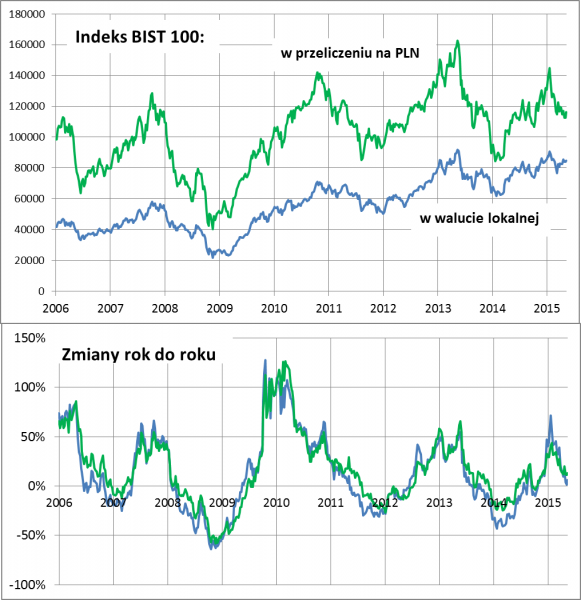Na tę kwestię nakłada się bardzo wyraźny, powtarzający się od lat cykl koniunkturalny na giełdzie w Stambule. W grudniu 2014 r. mieliśmy kulminację cyklu wzrostowego – roczna stopa zwrotu zbliżyła się do 50 proc. (a w ujęciu złotówkowym sięgnęła aż 70 proc.). Od tej pory cykl podąża w przeciwnym kierunku – roczne stopy zwrotu zbliżają się do zera. Historycznie zawsze schodziły poniżej zera – czy tak samo będzie i tym razem?