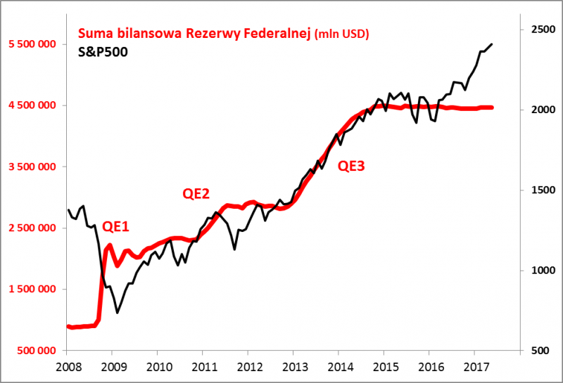 Jakie znaczenie QT może mieć dla rynków? Intuicyjnie - negatywne, skoro wcześniej QE przypisywano powszechnie bardzo pozytywny wpływ. Przez kilka lat S&P500 zdawał się kroczyć po ścieżce dokładnie wytyczonej przez przyrost sumy bilansowej Fedu (a ta rosła wraz ze skupem obligacji).
