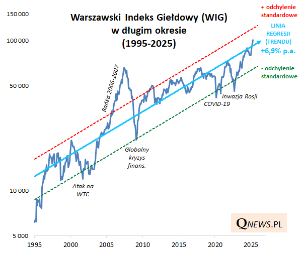 Zerknijmy na wykres indeksu obejmujący trzy dekady. Nanieśliśmy tu linię tzw. regresji (trendu), wokół której WIG rośnie na przestrzeni lat, oraz odchylenia od tej długoterminowej normy.