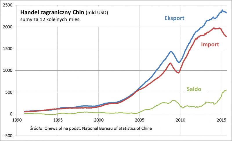 Jako najbardziej namacalny sygnał spowolnienia gospodarczego traktowany jest postępujący spadek importu (w tym surowców - stąd wynikają ich niskie ceny). Zauważmy jednak, że import maleje dużo szybciej niż eksport. Efekt jest taki, że chińska nadwyżka handlowa osiąga rekordowe poziomy (już niemal 550 mld USD w ostatnich 12 mies.) - o tym fakcie raczej rzadko się mówi.