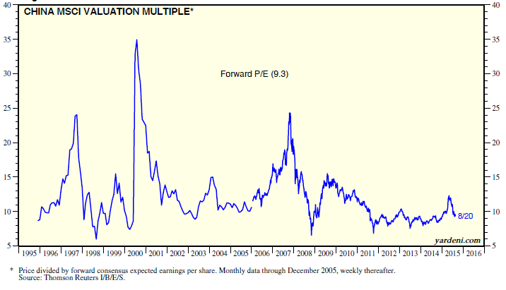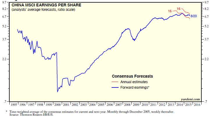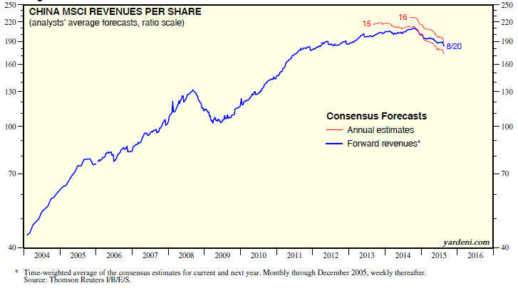Wskaźnik P/E, który w trakcie niedawnej kilkumiesięcznej bańki spekulacyjnej wystrzelił do czteroletnich maksimów, ostatnio właściwie powrócił już do poziomów sprzed tej bańki (8,5 na koniec sierpnia; na powyższym wykresie nie jest to jeszcze widoczne). Historycznie to wartości niewygórowane (zauważmy przy okazji, że nawet niedawny skok wycen był w miarę cywilizowany w porównaniu z największymi bańkami w przeszłości). Stąd już stosunkowo niewiele brakuje do rekordowo niskich wartości z jesieni 2011, jesieni 2008 lub sierpnia 1998 (P/E rzędu 6-7), kiedy to pojawiały się najlepsze okazje do kupowania akcji (nie tylko w Chinach). Oczywiście zawsze pozostaje groźba, że prognozy zysków także ugną się pod presją i zaczną spadać w ślad za przychodami (wówczas P/E rósłby nawet przy stabilnych kursach akcji - takie zjawisko obserwowaliśmy szczególnie w 2009 r.).