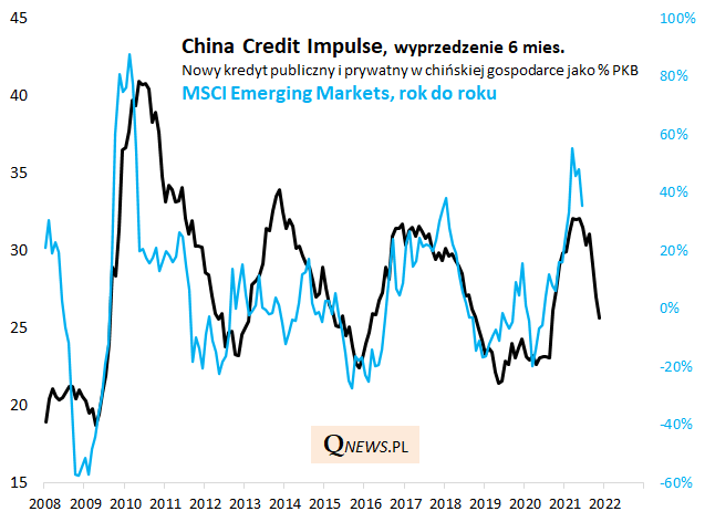 A "niedźwiedzie" argumenty? Szeroko opisywany przez nas słabnący chiński impuls kredytowy (notabene Chiny to największy rynek wschodzący) zdaje się jednoznacznie pokazywać kierunek rocznej dynamice MSCI EM. Wg tego modelu w okolicach końcówki roku powinna ona znaleźć się poniżej zera. 12-miesięczna dynamika zaczęła już zresztą wyraźnie zakręcać w dół z wysokiego pułapu (do pewnego momentu spadek dynamiki ze względu na tzw. efekt bazy nie musi jednak oznaczać spadku samego indeksu).