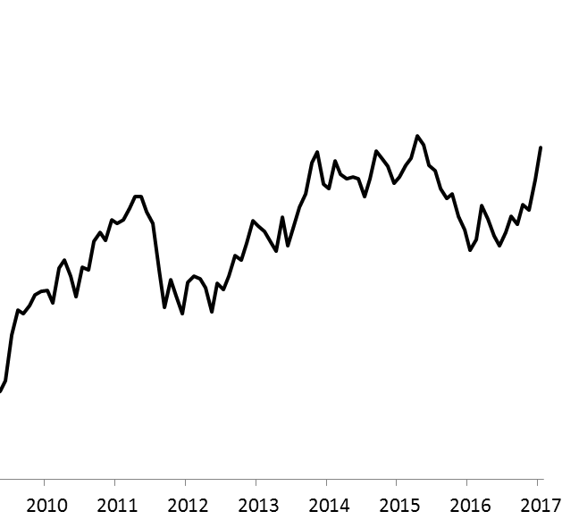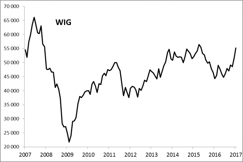 "Kupuj, gdy leje się krew" - to słynne giełdowe zalecenie sprawdziło się idealnie na warszawskim parkiecie. Przed rokiem WIG pogłębiał dołki i był najniżej od ponad trzech lat. Jak wówczas wskazywaliśmy, indeks zszedł w pobliże swej wartości księgowej (a to wcześniej zdarzało się niezwykle rzadko). Od tego czasu WIG poszybował w górę o 25% i na koniec stycznia znalazł się najwyżej od maja 2015 r. Teraz kolejnym celem będzie szczyt z kwietnia 2015 na poziomie ok. 56,5 pkt. (wg danych miesięcznych). Optymiści oczami wyobraźni widzą już też zapewne atak na historyczny rekord z 2007 r. (ok. 66 tys. pkt.), ale póki co to byłby bardzo ambitny cel (brakuje do niego ok. 20%).