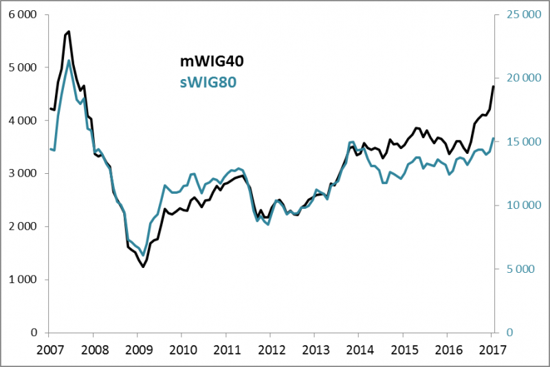 Co ciekawe nowe szczyty hossy trwającej od 2009 r. ustanowiły właśnie indeksy średnich i małych spółek. Szczególnie imponująco wyglądają ostatnie osiągnięcia mWIG40, który od kilku miesięcy zachowuje się wyraźnie lepiej niż gromadzący mniejsze spółki sWIG80. W samym styczniu mWIG zyskał 10,1% (!) - tak dobrego miesiąca nie było od prawie czterech lat.