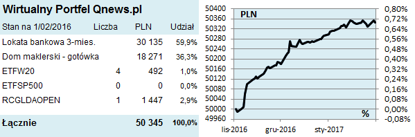 Mijają trzy miesiące od startu naszego Wirtualnego Portfela. Ostrożność i stopniowe podejście przy budowaniu jego struktury sprawiły, że Portfel nie zdążył "załapać się" na styczniową hossę (zarobił troszkę na wzroście WIG20). Będziemy czekać na okazje do budowania pozycji, nie tylko na rynkach akcji (do tego potrzebna byłaby mocniejsza korekta), ale też obligacji (czekamy na dalszy wzrost rentowności). Docelowo portfel ma mieć mocno zdywersyfikowany charakter. Póki co wygasającą 3 II lokatę 3-mies. zamieniamy na bardziej rentowną inwestycję w QUERCUS Ochrony Kapitału (w kwocie 30 tys. zł + zysk z lokaty czyli ok. 138 zł).