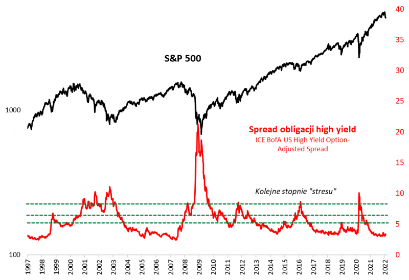 Kolejną kwestią, blisko spokrewnioną z barometrami „sentymentu”, ale mającą tę zaletę, że opartą na realnych pieniądzach, a nie tylko ankietach, jest poziom tzw. spreadów kredytowych (czyli różnicy między rentownością obligacji korporacyjnych a rentownością papierów skarbowych). Pokazany na wykresie spread dotyczący najbardziej ryzykownych obligacji typu „high yield” (o wysokiej rentowności), które są najbardziej spokrewnione z akcjami, ledwie drgnął w górę z relatywnie niskich poziomów. Tutaj zupełnie nie widać strachu, a przecież taki strach pojawiał się zawsze, gdy formowały się duże okazje do zakupów na Wall Street. Spread nie wszedł nawet na najniższy spośród trzech zaznaczonych na wykresie kolejnych stopni „stresu” rynkowego.