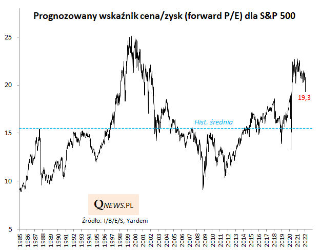 Ale czy to już okazja? Chyba niekoniecznie, skoro takie okazje historycznie odnotowywaliśmy, gdy P/E wędrował poniżej długoterminowej średniej (15,5). Obecnie jest ciągle ok. 25 proc. powyżej niej. Czy to poziom do utrzymania w świetle odbywającego się jastrzębiego zwrotu w polityce Fedu? Przypomnijmy, że ultra niskie stopy procentowe stanowiły często koronny argument za utrzymaniem wysokich wycen – tyle, że teraz te stopy mają szokowo zacząć iść w górę.