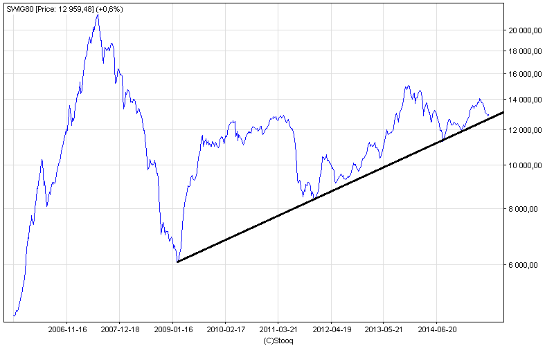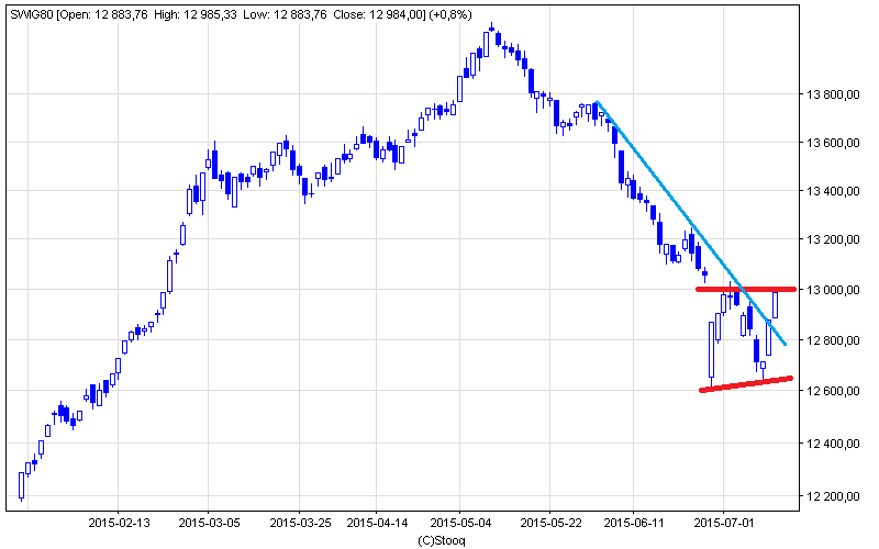 Sytuacja na wykresie z punktu widzenia prostej analizy technicznej wygląda na budowaną konsekwentnie formację odwrócenia trendu spadkowego. Kluczowy wydaje się poziom 13 tys. pkt. - jeśli uda się go pokonać, droga do powrotu trendu wzrostowego stanie otworem (przynajmniej w teorii).