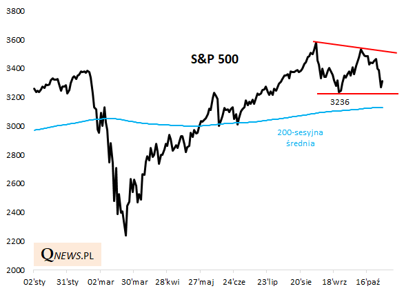 Rynki akcji przeżywają największą od marca falę spadkową. Oczy inwestorów zwrócone są przede wszystkim na amerykański S&P 500. Dalsze losy korekty w dużym stopniu zależą od tego, czy indeks ten zdoła utrzymać się powyżej tzw. wsparcia, czyli dołka z końcówki września (3236 pkt. w cenach zamknięcia i 3209 w cenach śródsesyjnych).