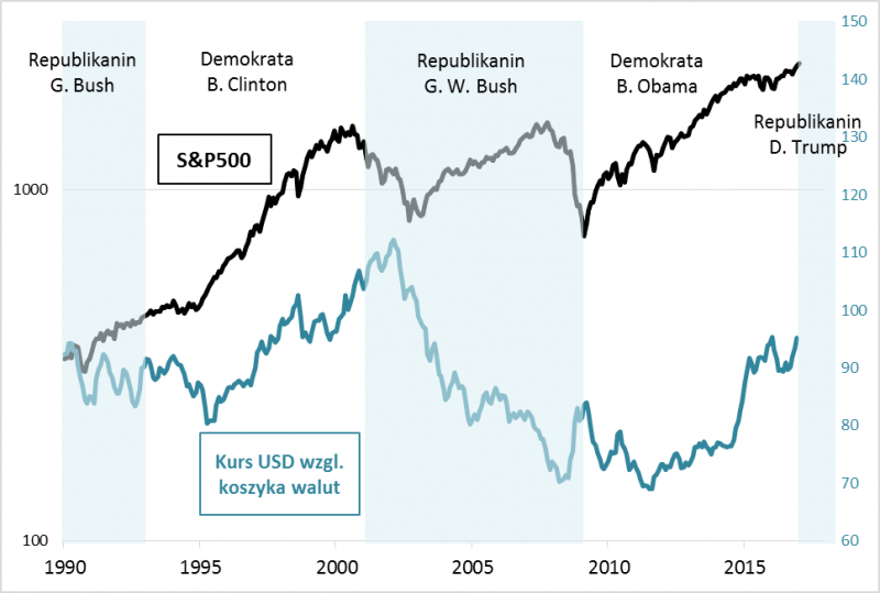 W naszej analizie pochylimy się jednak na kwestią tego, w jaki sposób barwna prezydentura Trumpa wpisuje się w długofalowe cykle gospodarczo-giełdowe. Jeszcze przed wyborami zwracaliśmy uwagę na specyficzny cykl polityczny. Od początku lat 90. minionego wieku Stanami rządziło na przemian dwóch Republikanów (G. Bush, G. W. Bush) i dwóch Demokratów (B. Clinton, B. Obama). Czy to przypadkiem czy nie, na okres rządów prezydentów demokratycznych przypadły długotrwałe fale spadku bezrobocia, silne hossy giełdowe oraz (po początkowym przejściowym osłabieniu) znaczne umocnienie dolara. Pod tymi względami Barack Obama, który właśnie pożegnał się z fotelem prezydenta, może pochwalić się niemal powtórką sukcesów z ery Billa Clintona (to ten od sloganu „Gospodarka, głupcze!”): stopa bezrobocia najniższa od lat, dolar najmocniejszy od lat, indeksy giełdowe na szczytach. Zadziwiające podobieństwo!