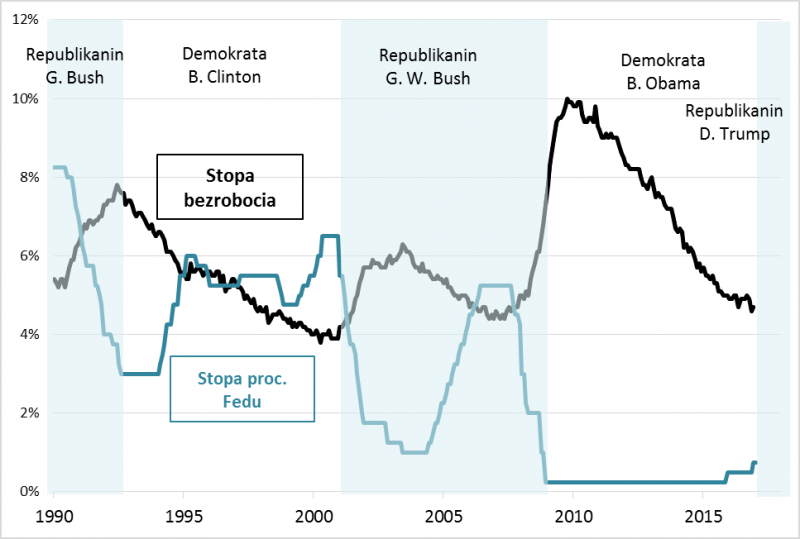 Bez względu na to, czy lubimy Trumpa czy nie, trzeba przyznać, że w przeciwieństwie do Obamy rozpoczyna on rządy w niefortunnym punkcie cyklu: według historycznych wzorców aż prosi się o odwrócenie trendu spadkowego stopy bezrobocia, w czym bardzo „pomogłaby” seria podwyżek stóp procentowych.