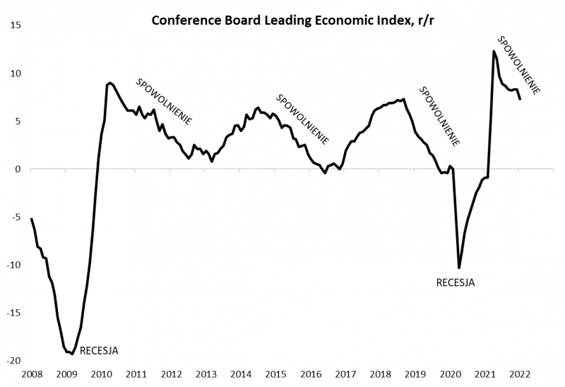 Zwróćmy jednak uwagę, że wybuch wojny na wschodzie komplikuje już i tak mocno problematyczny układ czynników takich jak wymykająca się spod kontroli inflacja, próba normalizacji polityki monetarnej przez Rezerwę Federalną czy też perspektywa spowolnienia gospodarczego. Punkt cyklu koniunkturalnego, w jakim jest amerykańska gospodarka, obrazuje pierwszy wykres. Wskaźnik wyprzedzający Conference Board już w lutym sygnalizował postępującą fazę spowolnienia względem szczytu post-pandemicznego boomu ekonomicznego. Można zakładać, że skutki rosyjskiej agresji i zachodnich sankcji będą dodatkowo sprzyjać pogłębieniu tego trendu, który jest ciągle na wczesnym etapie. Zauważmy, że nawet w tych historycznych przypadkach, gdy wskaźnik zaledwie otarł się o recesję (2012/13, 2016), dołek ustanowił dopiero w okolicach zera – teraz do tego pułapu ciągle daleka droga.