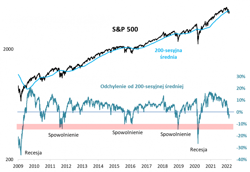 Zauważmy, że w każdym epizodzie cyklicznego spowolnienia amerykański benchmark lądował na poziomie od 10 proc. (2015-16) do ok. 15 proc. (2011, 2018) niższym od 200-sesyjnej średniej (w przypadku recesji ujemne odchylenie było jeszcze dużo głębsze).