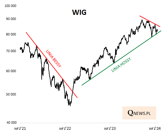 Ale na tym nie koniec paradoksów. Z nowymi rekordami na Wall Street coraz silniej kontrastuje sytuacja na GPW. Po ponad czterech miesiącach od chwili ustanowienia szczytu WIG nie tylko nie poprawia tego szczytu, ale ma najwyraźniej trudności z utrzymaniem się powyżej "linii hossy", czyli widocznej na poniższym wykresie linii trendu wzrostowego, łączącej lokalne dołki począwszy od marca 2022. Jednocześnie "od góry" zaczyna być coraz bardziej widoczna powstająca stopniowo linia trendu spadkowego.