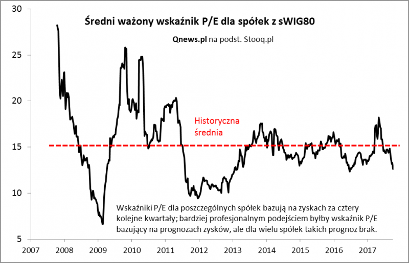 Spółki z sWIG80 są obecnie wyceniane na ok. 12,6-krotność bieżących zysków. Powyższy wykres sugeruje, że jest to poziom już wyraźnie niższy od wieloletniej średniej. Co więcej, niewiele niżej "maluchy" były wyceniane w dołku w połowie 2016 roku. Podobny poziom odnotowaliśmy też w dołku na jesieni 2014. Jak na ostatnie kilka lat, jest więc już tanio. Ale "super tanio" jeszcze oczywiście nie jest. Dużo niżej niż teraz wskaźniki cena/zysk schodziły jednak jedynie w okresach kryzysowych - na przełomie lat 2008/2009 (globalny kryzys finansowy) i w 2011 roku (obawy przed drugą falą kryzysu i rozpadem strefy euro).