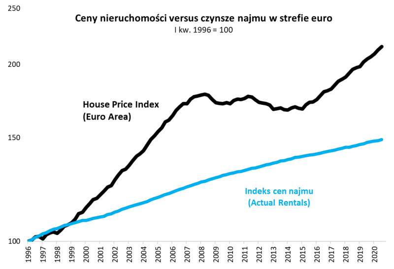 Pandemia jak na razie nie zatrzymała silnego wzrostu cen nieruchomości mieszkaniowych w Polsce i strefie euro. Paradoksalnie wyzerowanie stóp procentowych przez banki centralne wręcz sprzyja coraz większemu odrywaniu się cen od tempa wzrostu czynszów najmu.