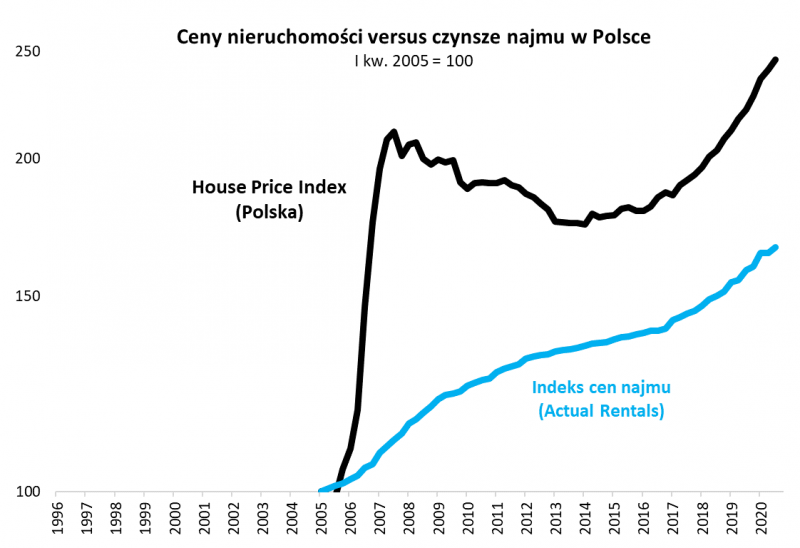Bardzo ryzykowne byłoby upieranie się przy tezie, że z tych poziomów ceny nieruchomości mieszkaniowych nie mogą już rosnąć. Ultra łagodna polityka monetarna wręcz sprzyja kontynuacji tego trendu. Ale na podstawie doświadczeń z poprzedniego boomu można natomiast zaryzykować tezę, że im mocniej ceny mieszkań oderwą się od tempa wyznaczonego przez czynsze, tym większa powstanie nierównowaga i tym boleśniejszy i długotrwały będzie potem proces przywracania równowagi.