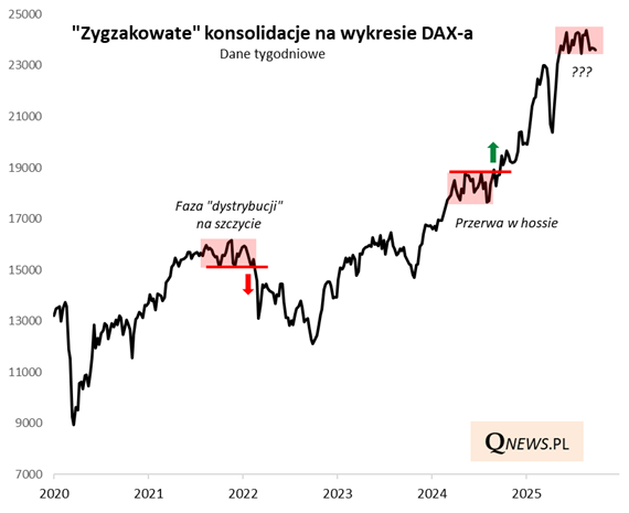W tych problematycznych okolicznościach coraz bardziej uwagę zwraca fakt, że niemiecki DAX dostał pewnej zadyszki po wcześniejszym gwałtownym odreagowaniu kwietniowego tąpnięcia (cła Trumpa). Szczególnie na wykresie w układzie tygodniowym widoczna jest tzw. konsolidacja notowań, która przybrała dość często spotykany w przypadku tego indeksu "zygzakowaty" kształt.