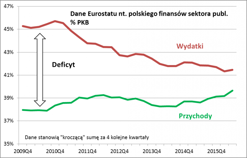 I tu pozytywne zaskoczenie - głównie na skutek wzrostu przychodów deficyt budżetowy stopniowo się kurczy. Eurostat podaje, że w kolejnych czterech kwartałach deficyt wyniósł już "tylko" 1,8% PKB, co jest poziomem najlepszym od lat.