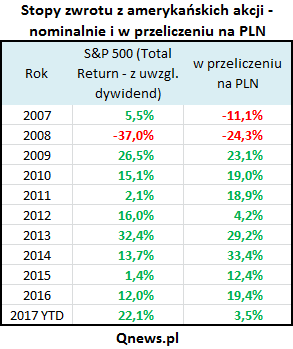 W kończącym się roku inwestorzy doświadczyć mogli ciekawego paradoksu. Na pierwszy rzut oka wydawać by się mogło, że amerykańskie akcje były świetną lokatą. Indeks S&P 500 jest prawie 20% na plusie od początku roku, a po uwzględnieniu dywidend stopa zwrotu rośnie jeszcze o kolejne ok. 2 pkt. proc. Dla indeksu był to nie tylko dziewiąty rok hossy, ale też jeden z najbardziej udanych w jej trakcie (lepsze były tylko lata 2013 i 2009). Okazuje się jednak, że jest jedno "ale", przynajmniej z punktu widzenia polskiego inwestora (ale nie tylko). W tym roku mieliśmy do czynienia z wyraźnym osłabieniem dolara względem złotego (od początku roku strata wynosi ok. 15%). Efekt jest taki, że inwestycja w instrumenty/fundusze dające ekspozycję na amerykański indeks w przeliczeniu na PLN dała w tym roku jakieś 4% zysku (a od tego trzeba by jeszcze odliczyć ewentualne opłaty za zarządzanie). To już zdecydowanie mniej imponujący rezultat. Okazuje się, że tegoroczna inwestycja w amerykańskie akcje za sprawą osłabienia USD przyniosła stopę zwrotu najniższą od ... pięciu lat.