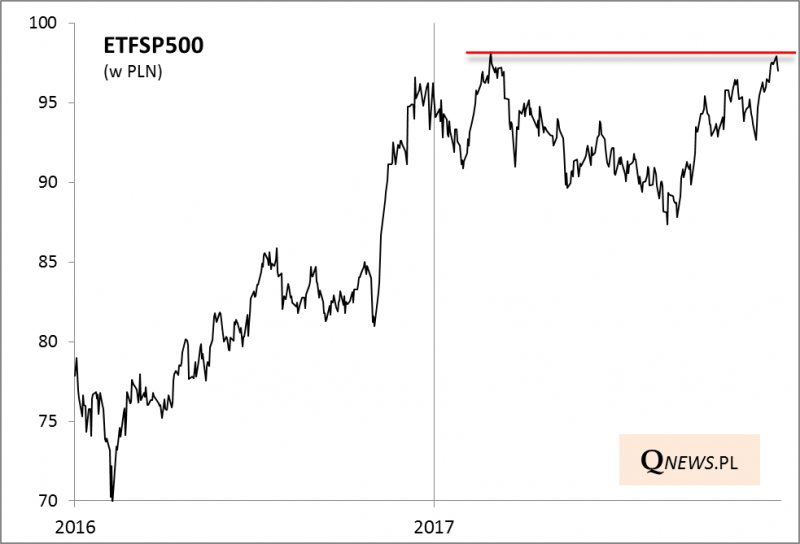 Ciekawie wygląda wykres denominowanego w naszej walucie ETF-a na S&P 500, który ciągle nie może sobie poradzić z pokonaniem wiosennego szczytu.