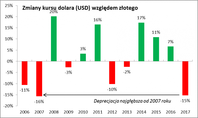 Jak pod tym względem będzie wyglądał przyszły rok? Z jednej strony S&P 500 ma za sobą dziewięć lat nieprzerwanej hossy, co w dotychczasowej historii zdarzyło się tylko jeden raz - w ostatnim roku wielkiej hossy lat 90. To sugerowałoby, że ryzyko inwestycyjne rośnie (już niebawem większa analiza na ten temat). A co z dolarem? Tutaj sytuacja wygląda zupełnie odmiennie. Mijający rok był najgorszym dla USD (względem PLN) od ... dziesięciu lat. W kolejnym roku (2008) dolar ... umocnił się o 20%.