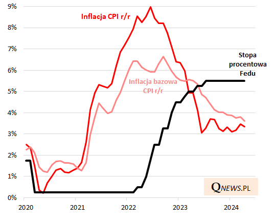 Chociaż inflacja bazowa CPI jest ciągle zbyt wysoka względem celu Fedu, to jednak jej dalsze obniżanie się, w połączeniu z bardziej akceptowalnymi poziomami konkurencyjnego wskaźnika Core PCE (jego wartość za kwiecień poznamy dopiero 31 maja), sprzyjają powrotowi oczekiwań na obniżki stóp procentowych. Zwróćmy uwagę, że bez względu na to, który wskaźnik inflacji weźmiemy pod uwagę, powiększa się dystans względem stopy Fedu (5,25-5,50 proc.), a innymi słowy powiększa się realna stopa procentowa, która może stopniowo coraz bardziej negatywnie oddziaływać na koniunkturę gospodarczą. Fed będzie więc pod coraz większą presją na rozpoczęcie cyklu obniżek.