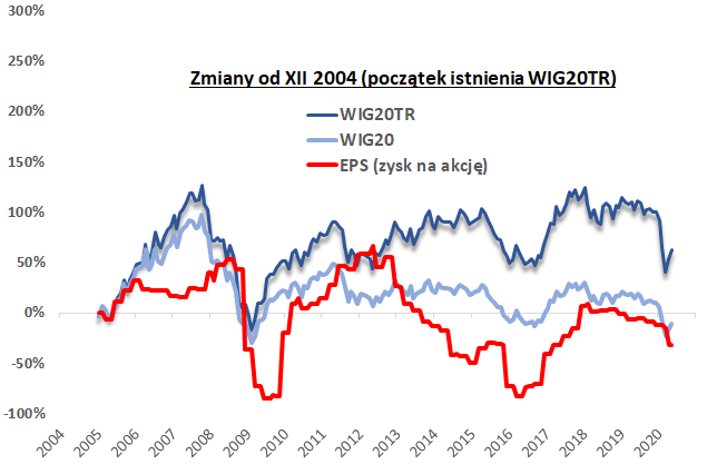 Można w pewnym sensie powiedzieć, że WIG20 to niejako „koślawy” substytut obligacji korporacyjnej o wysokim ryzyku („high yield”), bo w długim okresie jego wartość nominalna (czyli indeks cenowy) właściwie stoi w miejscu (a po drodze ulega gwałtownym, spekulacyjnym fluktuacjom), zaś całe zyski inwestorów wynikają z wypłacanych „odsetek” (czyli dywidend).