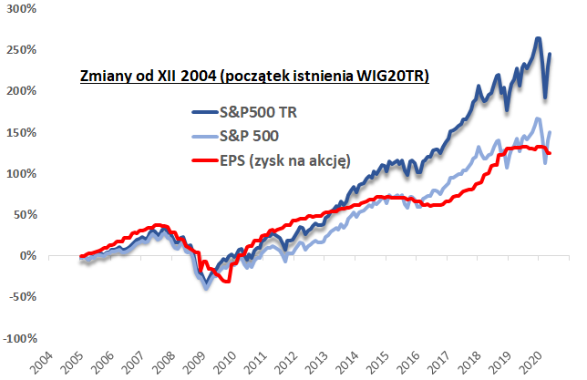 Co jest tym kluczowym czynnikiem? Zarówno dane zawarte w tabeli, jak i wykresy, nie pozostawiają co do tego żadnej wątpliwości. Przyczyną są drastyczne rozbieżności, jeśli chodzi o zmiany zysków spółek. W przypadku S&P 500 w omawianym okresie EPS urósł o ok. 125 proc. Z kolei w przypadku WIG20 … zmalał, i to prawie o jedną trzecią (!).