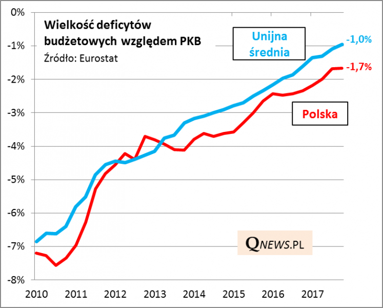Porcja dobrych wieści z finansów publicznych. Deficyt budżetowy w Polsce skurczył się do 1,7% PKB - podał Eurostat. Ale błędne byłoby przypuszczenie, że to wyłącznie polskie osiągnięcie. Dokładnie taki sam trend panuje w całej UE. Polska jest pod tym względem nawet gorsza od średniej unijnej (deficyt na poziomie 1% PKB).