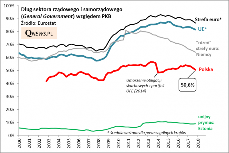 Stosunkowo mały deficyt skutkuje jednocześnie wolniejszym wzrostem zadłużenia, podobnie jak niskie stopy procentowe. W przeliczeniu na PKB nasz dług publiczny nawet zaczął wyraźnie maleć. Na koniec IV kw. było to 50,6% PKB - najmniej od trzech lat.