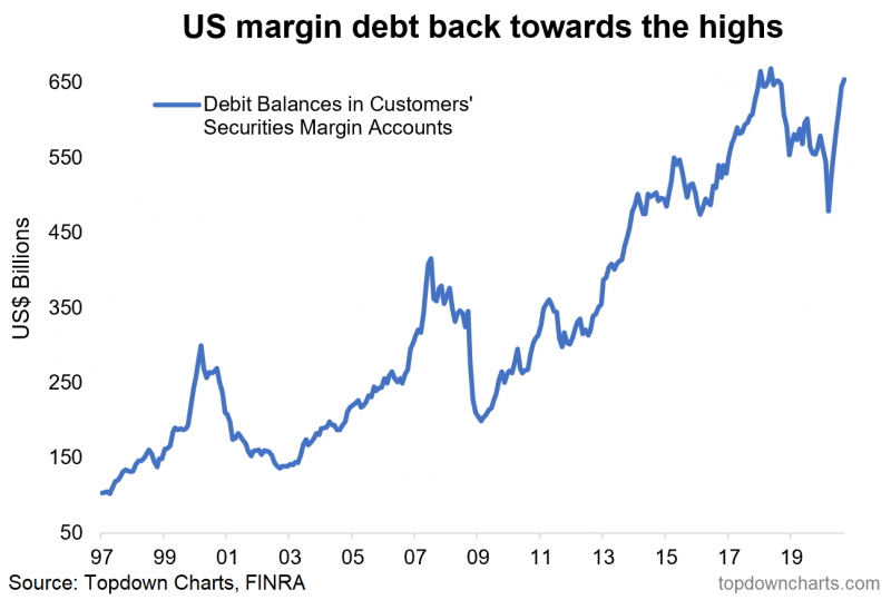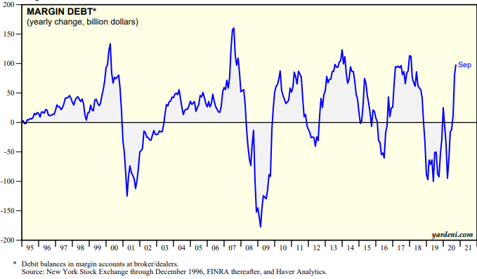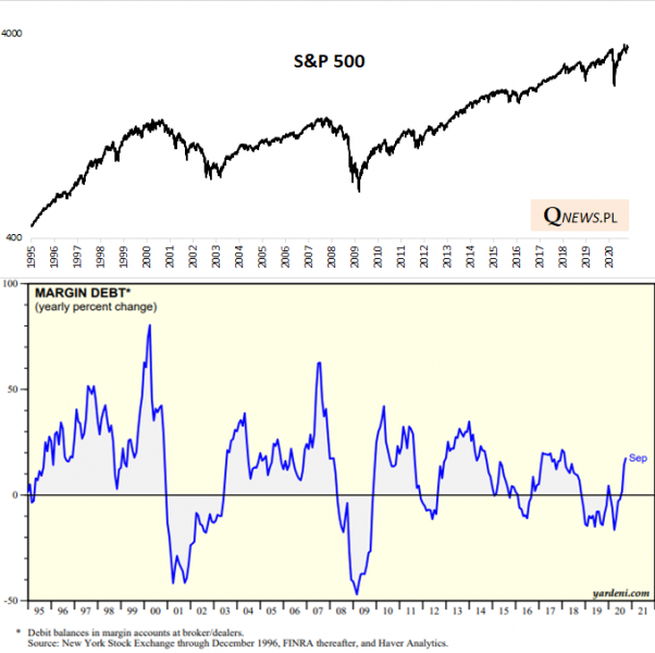 Nieco inaczej sytuacja wygląda, jeśli na zmiany długu popatrzymy nie w ujęciu nominalnym, lecz naszym zdaniem bardziej poprawnym metodologicznie ujęciu procentowym. Okazuje się, że margin debt jest niespełna 20% większy niż przed rokiem. I nie jest to jeszcze poziom szczególnie wysoki na tle historii. Przykładowo na szczytach bańki internetowej w 2000 roku zadłużenie na rachunkach rosło w tempie przeszło 80% (!) rok do roku.