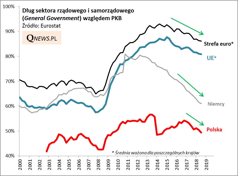 Na koniec III kwartału 2018 współczynnik spadł do 49,4% PKB, co jest poziomem najniższym od ponad czterech lat.