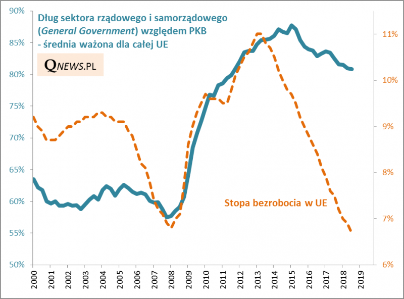 Jeśli za wyznacznik koniunktury gospodarczej wziąć stopę bezrobocia, to współczynniki zadłużenia - zarówno w Polsce jak i całej UE - są ciągle sporo wyżej niż powinny być, gdyby zależały tylko od koniunktury gospodarczej (a nie od decyzji polityków).