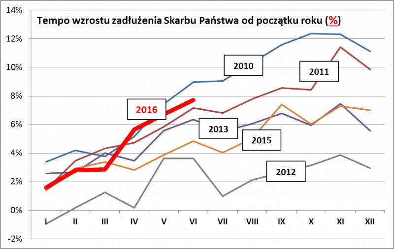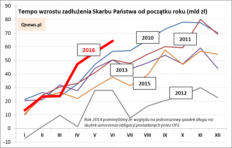 Tym razem warto jednak odnotować jeszcze jedną kwestię - tempo wzrostu długu. Od początku roku do końca czerwca (za który poznaliśmy właśnie najświeższe dane) zadłużenie Skarbu Państwa urosło o 64,4 mld zł (!). Porównanie z poprzednimi latami dowodzi, że w I półroczu tempo zadłużania w ujęciu nominalnym było rekordowe (przynajmniej na tle lat 2010-2015, za jakie wykonaliśmy obliczenia).