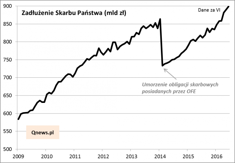 Jak co miesiąc, kilka zdań na temat zadłużenia polskiego Skarbu Państwa. To, że mamy nowy rekord (już niemal 900 mld zł) nie jest żadną niespodzianką. Jak wielokrotnie wskazywaliśmy, zadłużenie od lat jest w trendzie wzrostowym, a operacja z 2014 roku (umorzenie obligacji posiadanych przez OFE) jedynie na chwilę zatrzymała tę tendencję.