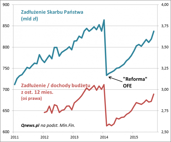 Na marginesie można nieco ironicznie zastanawiać się, jak to możliwe, skoro według byłego ministra finansów Jacka Rostowskiego, "System OFE spowodował połowę wzrostu długu od czasu wprowadzenia reformy (z 1999 r. - przyp.)". Dlaczego zatem po "odchudzeniu" aktywów i wpływów OFE dług znów rośnie w takim samym tempie jak wcześniej?
