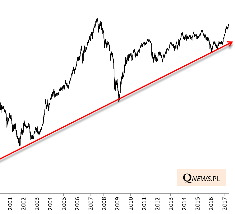 Bardzo często w komentarzach na temat sytuacji giełdowej patrzy się na nią przez pryzmat krótkoterminowych trendów. My postarajmy się spojrzeć z perspektywy wielu lat. Wykres WIG-u obejmujący ponad 20 lat pokazuje jednoznacznie, w jakim trendzie jest indeks na długą metę – wzrostowym. Obrazuje go choćby linia przebiegająca w okolicy istotnych dołków (1995, 2001-2002, 2009). Wygląda na to, że nie tak dawno temu, w I poł. 2016 r. WIG dwukrotnie odbił się w okolicach tej linii, co tłumaczyłoby siłę ostatnich zwyżek.
