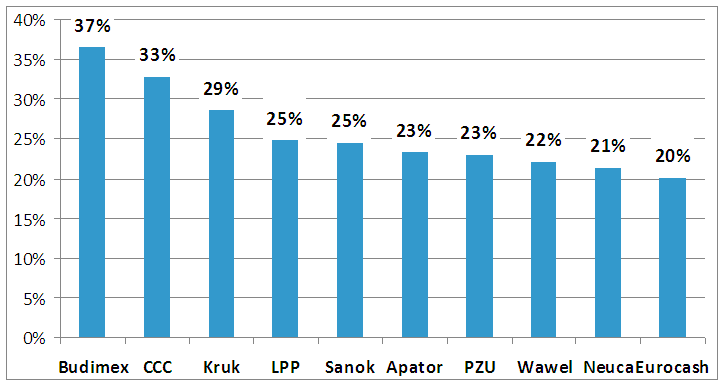Rys. 2. Spółki z WIG20/mWIG40 o najwyższych wskaźnikach ROE