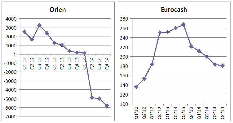 Pierwszy wniosek, jaki nasuwa się przy analizie zbiorczych rezultatów jest taki, że poprawa ma dość wybiórczy charakter. Bardzo dalekie od prawdy byłoby stwierdzenie, że mamy do czynienia z powszechnym wzrostem zysków. Fakty są takie, że w IV kw. ub.r. lepsze wyniki netto względem IV kw. 2013 r. odnotowało 47% spółek ze wspomnianych indeksów. Okazuje się przy tym, że relatywnie słabo wypada pod tym względem przede wszystkim WIG20. W jego gronie jedynie 6 spośród 20 spółek (czyli tylko 30 proc.!) miało wynik netto w IV kw. lepszy niż przed rokiem. Na dodatek trzy firmy wygenerowały idące w setki milionów lub nawet miliardy złotych straty w skali całego roku (JSW, Lotos, PKN Orlen).