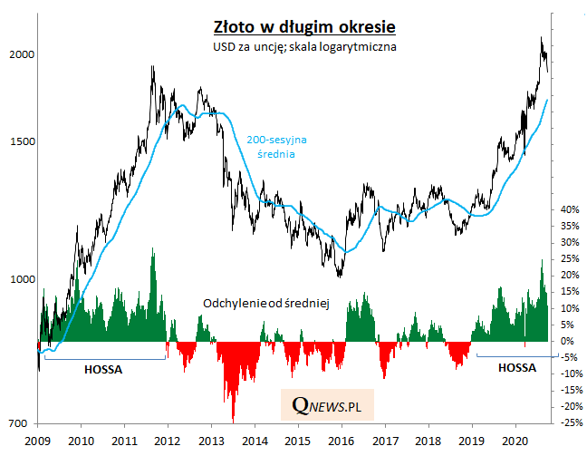 Złoto, podobnie jak akcje, poddało się korekcie spadkowej. Jak pokazujemy na poniższym wykresie, w trakcie hossy (takiej jak ta obecna, trwająca od 2019 roku, czy też takiej jak ta w latach 2009-11) takie korekty są czymś naturalnym. Dzięki nim redukowane jest nadmierne odchylenie od trendu, a po schłodzeniu tendencja zwyżkowa jest wznawiana. O ile w szczycie hossy cena uncji złota była aż 25% powyżej 200-sesyjnej średniej, to od tej pory odchylenie to zostało zredukowane poniżej 10% (przy czym sama średnia ciągle rośnie).