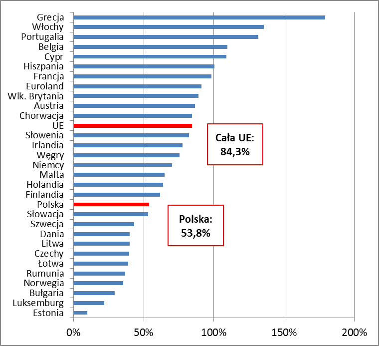 Rys. 1. Ranking krajów UE według poziomu zadłużenia względem PKB