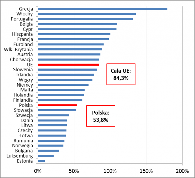Na początek nasz kraj. Zacznijmy od relatywnie dobrych wiadomości. Ze wskaźnikiem zadłużenia na poziomie 53,8 proc. PKB Polska jest poniżej unijnej „normy”. Średnia ważona dla całej UE to 84,3 proc., a w przypadku samego Eurolandu jeszcze więcej – aż 91,2 proc. Oczywiście są też kraje o dużo mniejszym zadłużeniu, a wśród nich przede wszystkim bałtyckie i niektóre skandynawskie. Ogólnie potwierdza się nieco szablonowa reguła: z pewnymi wyjątkami kraje Północy są stosunkowo mało zadłużone, podczas gdy ze z Południa Europy – dużo bardziej, niekiedy wręcz drastycznie, jak Grecja, Włochy czy Portugalia.