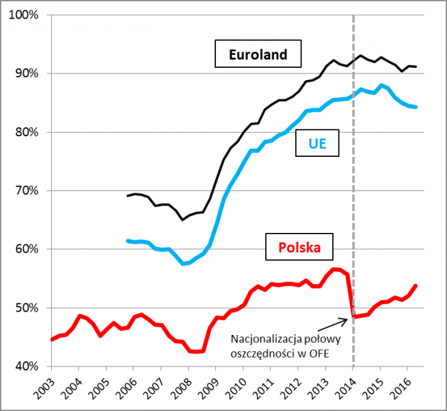 Częściowa nacjonalizacja oszczędności Polaków zgromadzonych w Otwartych Funduszach Emerytalnych w I kw. 2014 r. była propagandowo uzasadniana jako konieczna do zatrzymania wzrostu zadłużenia publicznego. Pojawił się wręcz argument, że to system OFE winny jest narastania długu. Niestety praktyka pokazuje, że wkrótce po tej kontrowersyjnej operacji dług zaczął na nowo rosnąć – i to niestety w takim tempie jak wcześniej. Sprawa wygląda tym gorzej, że przecież w tym samym czasie w całej UE dług jednak maleje. W samym II kwartale br. polski dług powiększył się o 1,7 proc. PKB, do 53,8 proc. – to poziom najwyższy od 2,5 roku. Jeśli już coś udało się osiągnąć za sprawą nacjonalizacji, to odroczenie w czasie dojścia do niebezpiecznych pułapów. Gdyby nie tamto posunięcie, to łatwo oszacować, że już teraz dług mógłby przekroczyć granicę 60 proc. PKB. Z drugiej strony, być może w obliczu takiej groźby politycy bardziej ochoczo wzięliby się za ograniczanie deficytu budżetowego?